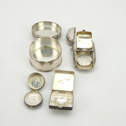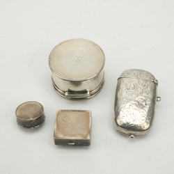 | Omschrijving | Lot van vier zilveren doosjes: twee 20e eeuwse eerste gehalte (925/1000) zilveren pillendoosjes, rond en vierkant, beide gemerkt '925'. Een antieke 19e eeuwse verzilverde vesta case met munthouder, gemerkt 'patent 4709'. En een Nederlands tweede gehalte (835/1000) rond zilveren doosje, 1906 |