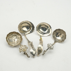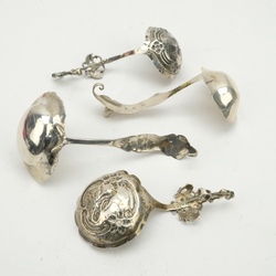 | Omschrijving | Lot van vier zilveren roomlepels: Eén 19e eeuwse met graveerwerk en bekroning van eikel op de steel, mr. van der Meulen, Joure. Een 19e eeuwse bekroond met zeilschip, gesoldeerd. Een 18e eeuwse met gedreven voorstelling van haan in de bak, ongekeurd en een 18e eeuwse met gedreven voorstelling van vogel in de bak, met onduidelijk meesterteken (FG?). Beide 18e eeuwse lepels met reparaties |