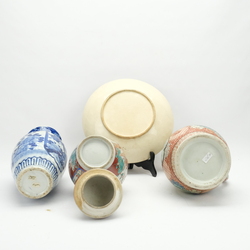 | Omschrijving | Een Japans porseleinen dekselvaas, oorkan, een boeren imari vaas en een satsuma aardewerken schotel. Allen vroeg 20e eeuws. |