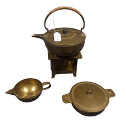 | Omschrijving | Lot van vier stuks messing: theelichtje, theepot, melkkan en suikerpot. Ongemerkt, in de stijl van Jan Eisenloeffel. |
