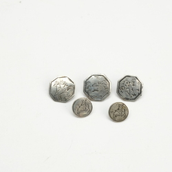 | Omschrijving | Lot van vijf 18e/19e eeuwse zilveren knopen, voorstelling van ruiter te paard |