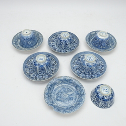 | Omschrijving | Lot van zes antieke Chinees porseleinen kop en schotels. Vier met blauw-wit decor, gemerkt met vierkaraktermerk. Kangxi revival, laat Qing, 19e eeuws. Met daarbij nog twee 19e eeuwse kopjes en drie schotels |