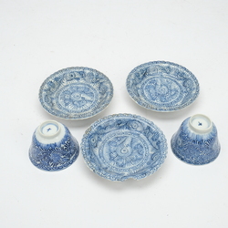 | Afmetingen | Set 1: twee kopjes met haarlijn, één met meerdere haarlijnen en chip. Eén schotel met chip 7 mm. Set 2: een schotel met grote chip, twee gelijmd. Kopjes beide met haarlijn van ca. 5 cm |