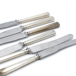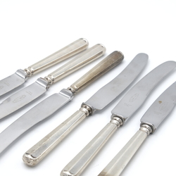 | Omschrijving | Lot van zes 20e eeuwse fruitmesjes met tweede gehalte (835/1000) zilveren heft, model Haags Lofje. Mr. van Kempen. |