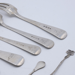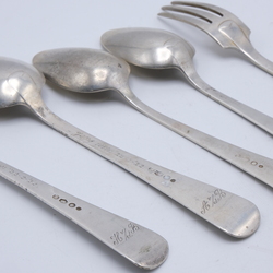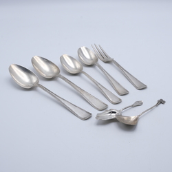| Omschrijving | Lot divers tweede gehalte (835/1000) zilveren bestek met parelrand: twee grote lepels, twee kleine lepels en een vork. Allen gegraveerd met initialen en/of datum. Met daarbij twee zilveren suikerschepjes |