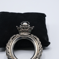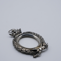 Zilveren bodebus, onder meer versierd met lauwerkrans en kroon.