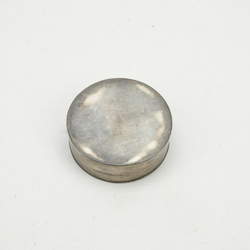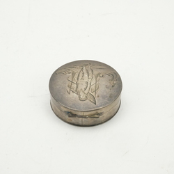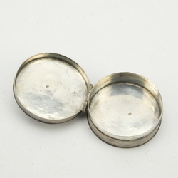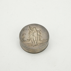 | Omschrijving | Een antiek 19e eeuws rond zilveren doosje met op de deksel gegraveerd decor van visserman met schepnet en vis voor enkele schepen. Aan de binnenzijde meesterteken 'JB' |