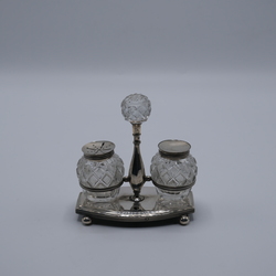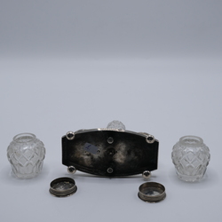 Zilveren inkstel met kristallen potjes.