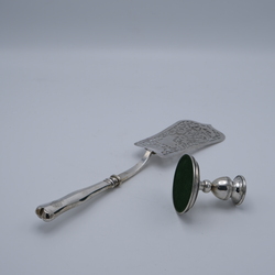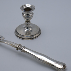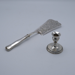 | Omschrijving | Een eerste gehalte (925/1000) zilveren kaarsenhouder, gemerkt ‘925’. Met daarbij een verzilverde visschep, ajour gezaagd en gegraveerd met decor van een vis tussen bladeren, gegraveerd met initialen en een familiewapen, onduidelijk gemerkt. |