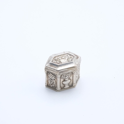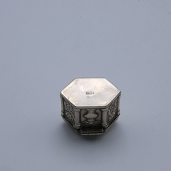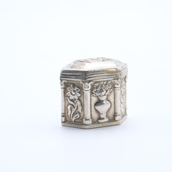 | Omschrijving | Een 20e eeuwse tweede gehalte (835/1000) zilveren lodereindoosje met decor van bloemen en bloemenvazen tussen pilaren |