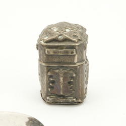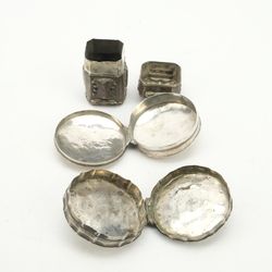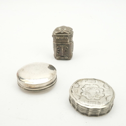 | Omschrijving | Lot van drie tweede gehalte (835/1000) zilveren doosjes. Een antiek 19e eeuws zilveren lodereindoosje, onduidelijk meesterteken, 1876. Een vroeg 19e eeuws rond pepermuntdoosje, meesterteken 'TVV", 1828. En een 19e eeuws pepermuntdoosje, vermoedelijk Cammans Leeuwarden |