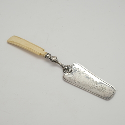 | Omschrijving | Een antieke Duits (750/1000) zilveren taartschep, gegraveerd met portret in medaillon en met benen heft. Gemerkt '13' |