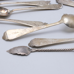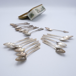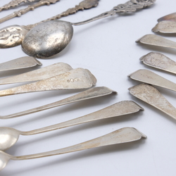| Omschrijving | Lot van 19 tweede gehalte (835/1000) zilveren theelepels, diverse motieven en makers |