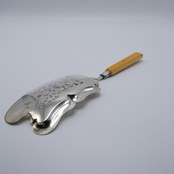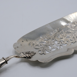 Met graveer- en zaagwerk versierde zilveren visschep. J. v.d.Vorst, Rotterdam, 1854.