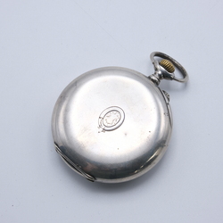 | Omschrijving | Een vroeg 20e eeuws Longines herenzakhorloge in derde gehalte (800/1000) zilveren kast. Emaille wijzerplaat met Arabische cijfers, secondeaanduiding en vergulde wijzers. |