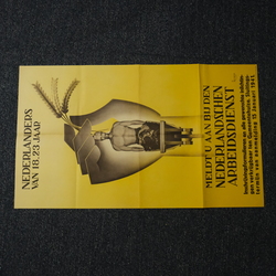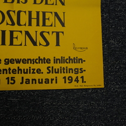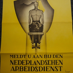 | Omschrijving | Affiche, 'Nederlanders van 18-23 jaar', 'meldt U aan bij den Nederlandschen Arbeidsdienst', 'inschrijvingsformulieren en alle gewenschte inlichtingen verkrijgbaar ten Gemeentehuize. Sluitingstermijn van aanmelding 15 Januari 1941'. Gesigneerd Reimers, 1941. |