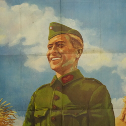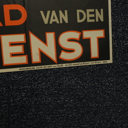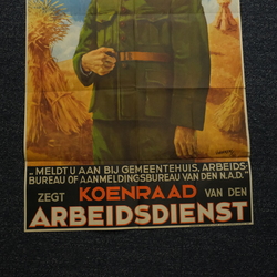 | Omschrijving | Affiche, '"Meldt u aan bij gemeentehuis, arbeidsbureau of aanmeldingsbureau van den N.A.D." zegt Koenraad van den Arbeidsdienst', met onderschrift 'Goedgekeurd door het Dept. Van V. en K. no. 25 hangtijd 10 sept tot 10 oct 1942'. Gesigneerd 'van der Erf' |