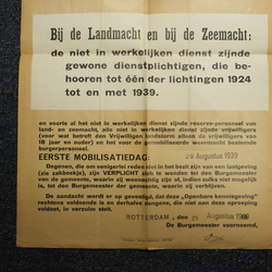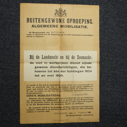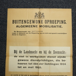 | Omschrijving | Affiche, 'Buitengewone oproeping Algemeene Mobilisatie'. Gedateerd Rotterdam, 28 augustus 1939 |