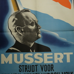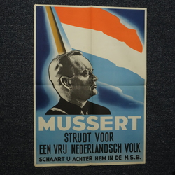 | Omschrijving | Affiche, 'Mussert Strijdt voor een vrij Nederlandsch Volk, schaart u achter hem in de N.S.B.'. Gesigneerd (in de druk) van Altena. |