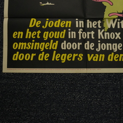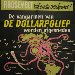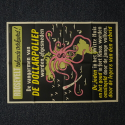 | Omschrijving | Affiche, 'Roosevelt rekende verkeerd! De vangarmen van de Dollarpoliep worden afgesneden', 'de joden in het Witte Huis en het goud in fort Knox worden omsingeld door de jonge volken, door de legers van den arbeid'. Ontwerp Louis Manche, 1942 |