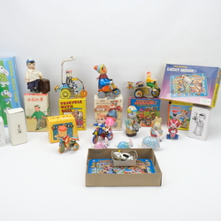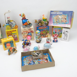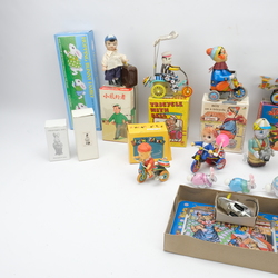 | Omschrijving | Lot divers Chinees blikken speelgoed, 20e eeuws, veel in doos, waaronder diverse driewielers |