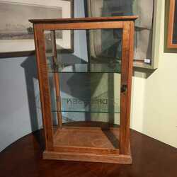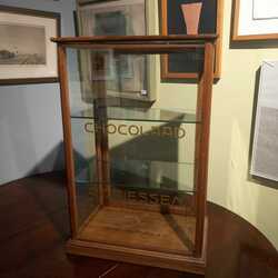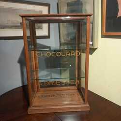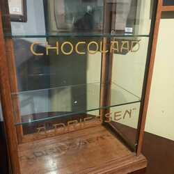 | Omschrijving | Een vroeg 20e eeuws eikenhouten toonbankvitrine met twee glazen planken. Met aan de voorzijde gegraveerde tekst 'Chocolaad A. Driessen' |