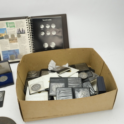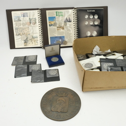 | Omschrijving | Een grote collectie met penningen Dokkum 400 jaar vestingstad in 1981, meeste nog in hoesjes en doosjes. Hierbij een groter bronzen exemplaar.Daarbij nog twee muntalbums met diverse munten uit Hong kong, Australië, Nederlandse antillen etc. |