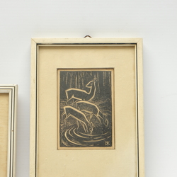 | Omschrijving | Lot van twee houtsnedes, voorstelling van hertjes. Rechtsonder gemonogrammeerd Dirk Kerst Koopmans (Aldlemmer 1906 - Balk 1998) |