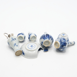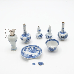 | Omschrijving | Lot divers miniatuur Chinees poppengoed, o.a. twee Kangxi kalebasvazen, twee pijpvazen, een kopje en een vaasje met zilveren montuur en een koekoek in een huis kopje. |