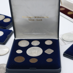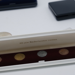 | Omschrijving | Lot divers 20e eeuws Nederlands muntgeld: een cassette ‘88 jaar Nederlandse centen’ met 5 centen, periode 1929-1980, een cassette Koningin Wilhelmina 1898-1948, een cassette met zilveren Gulden Wilhelmina 1929, een cassette met zilveren Rijksdaalder en Gulden, 1922 en 1930, een cassette met 5, 10 en 25 cent, Wilhelmina, 1941 en 1944, zes Tien gulden munten, 1970-1973, een zilveren Rijksdaalder 1966 en een zilveren Gulden, 1955. |