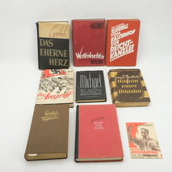| Omschrijving | Lot diverse boeken: 'Der Angriff Aufsatze aus der Kampfzeit', door J. Goebbels, 5. Auflage, 1936, 'Michael, Ein deutsches Schicksal in Tagebuchblättern', door J, Goebbels, 5. auflage, 1934, 'Joseph Goebbels: Dämon einer Diktatur' door Werner Stephan, eerste oplage 1949, 'Das Eherne Herz, Goebbels, eerste oplage 1943, Wetterleuchten, 2e oplage 1939, 'Vom Kaiserhof zur Reichskanzlei', 21. auflage, 1937', 'Tagebucher aus den Jahren 1942-1943', Atlantis Verlag Zurich & 'Die Zeit ohne Beispiel', Goebbels 1941, 'Dreissig Kriegsartikel für das Deutsche Volk', Goebbels, 1943 |