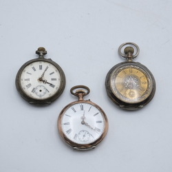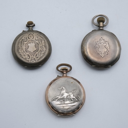 | Omschrijving | Lot van drie antieke zakhorloges: één derde gehalte zilver, gedeeltelijk verguld en met afbeelding van een paard. Een met vergulde wijzerplaat, ook derde gehalte. En een derde gehalte zilveren exemplaar in slechte staat, zonder glas, secondewijzer etc. |