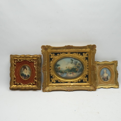 Lot van drie 20e eeuwse lijstjes, twee met damesportretten, één met landschap.