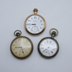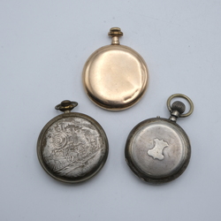 | Omschrijving | Lot van drie zakhorloges, waaronder een verguld exemplaar, gemerkt Admiral, beschadigd. En een koperen exemplaar, gemerkt Haller, met decor van een trein op de achterkant.m |