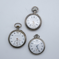 | Omschrijving | Lot van twee derde gehalte (800/1000) zilveren zakhorloges, één gemerkt Union Horlogerie. Met daarbij een verzilverd exemplaar, gemerkt 'Admirable' |