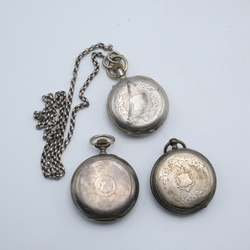 | Omschrijving | Lot van drie derde gehalte (800/1000) zilveren herenzakhorloges, waarvan één gemerkt 'Overstrijd Rotterdam' en één aan zilveren jasseroncollier |