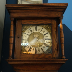 | Omschrijving | Staande Engelse klok in een mahoniehouten kast. Vroeg 19e eeuws. Wijzerplaat voorzien van romeinse cijfers en gesigneerd : J. N. Brown, Lyme. |