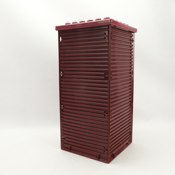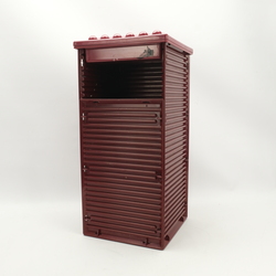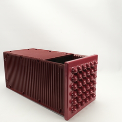 Een design prullenbak, ontwerp Ettore Sottsass voor Olivetti.