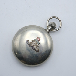 | Omschrijving | Een groot vroeg 20e eeuws zakhorloge, op de achterzijde met emaille plaatje met kanon en spreuk 'quo fas et gloria ducunt' = Royal Artillery, Verenigd Koninkrijk |