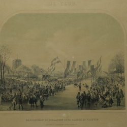 | Omschrijving | Een 19e eeuwse lithografie, ‘IJs-club’ en ‘Hardrijderij op schaatsen door mannen en vrouwen gehouden te Leeuwarden op den 22 Februarij’. Naar de natuur geteekend door W. Troost, steendruk van P. Blommers, ’s Gravenhage 1855. |