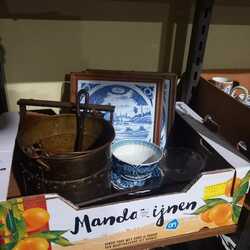 Lot divers, waaronder twee vierpas tegeltableaus en een koperen emmer