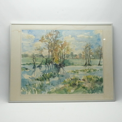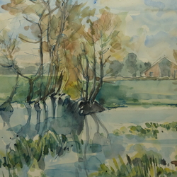 | Omschrijving | Aquarel op papier. Poel in het voorjaar. Rechtsonder gesigneerd Nanko van Dijk (Dokkum, 1941), gedateerd 1981 |