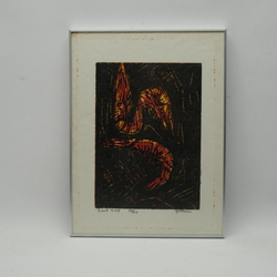 | Omschrijving | Kleurenhoutsnede, voorstelling van Garnalen. Gesigneerd Piet Lont (1947), gedateerd 2015, oplage van 35. |