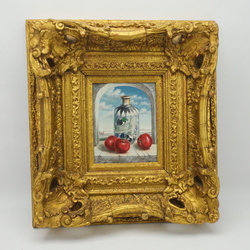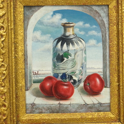 | Omschrijving | Schilderij, olieverf op paneel, in grote vergulde lijst. Stilleven met tomaten en Perzisch vaasje in een venster. Rechtsonder gesigneerd S. Brands, gedateerd 1990 |
