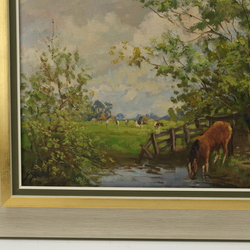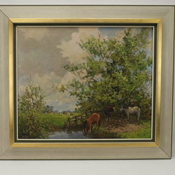 | Omschrijving | Schilderij, olieverf op doek. Drie paarden bij de sloot. Linksonder gesigneerd Sjoerd de Vries (Franeker 1909 – Alkmaar 1996), ca. 1970. Herkomst: van Hulsen, Leeuwarden. |