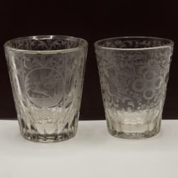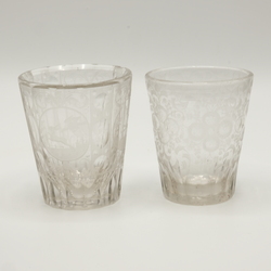 | Omschrijving | Lot van twee antieke 18e eeuwse Duitse gegraveerde glazen: één met floraal decor, de andere met medaillons, waaronder een jachtvoorstelling en een engel met een brandend hart op een aambeeld. |
