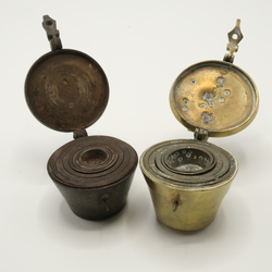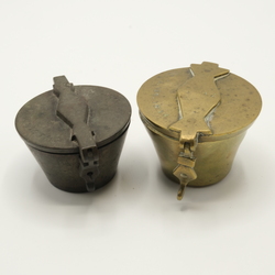 Lot van twee antieke sluitgewichten, één messing, gemerkt ‘5 Ned. Oncen’.