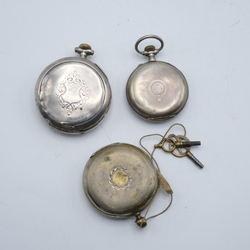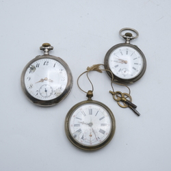 | Omschrijving | Lot van drie zakhorloges, één met derde gehalte (800/1000), beschadigde kast en wijzerplaat, één met twee sleutels in verzilverde kast, zonder oogje en een kleiner model, tevens in derde gehalte (800/1000) zilveren kast |