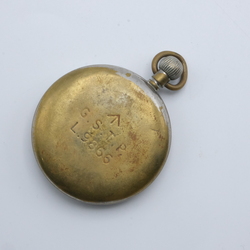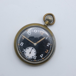 | Omschrijving | Een 20e eeuws Brits WO II zakhorloge met zwarte wijzerplaat in verzilverde kast, met opschrift 'G.S.T.P. L.9865' |