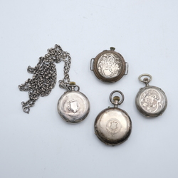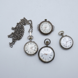 | Omschrijving | Lot van vier zilveren en verzilverde dameszakhorloges, een verbouwd tot polshorloge en één aan tweede gehalte (835/1000) zilveren jasseroncollier |